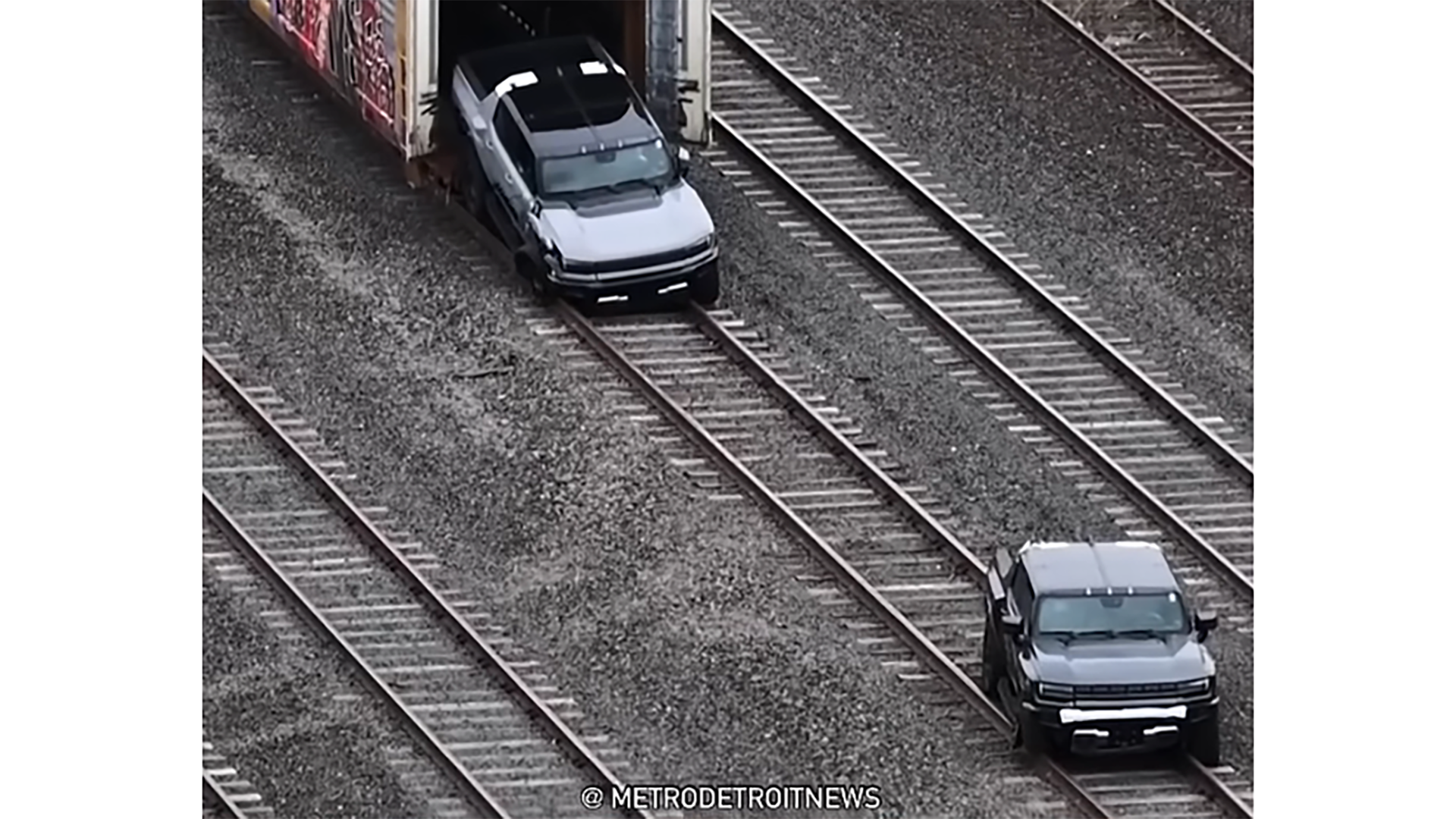 Police responded to the call of a suspected break-in at the General Motors Factory Zero plant train yard around 6:45 a.m. on Tuesday, May 20, 2025. The thieves managed to get the rear container doors open and apparently attempted to drive the Hummer EVs straight off the back of the train and onto the tracks. It's not clear what exactly the get-away plan would have been from there, but it likely involved ramming through another gate or fence had the vehicle stayed together.
